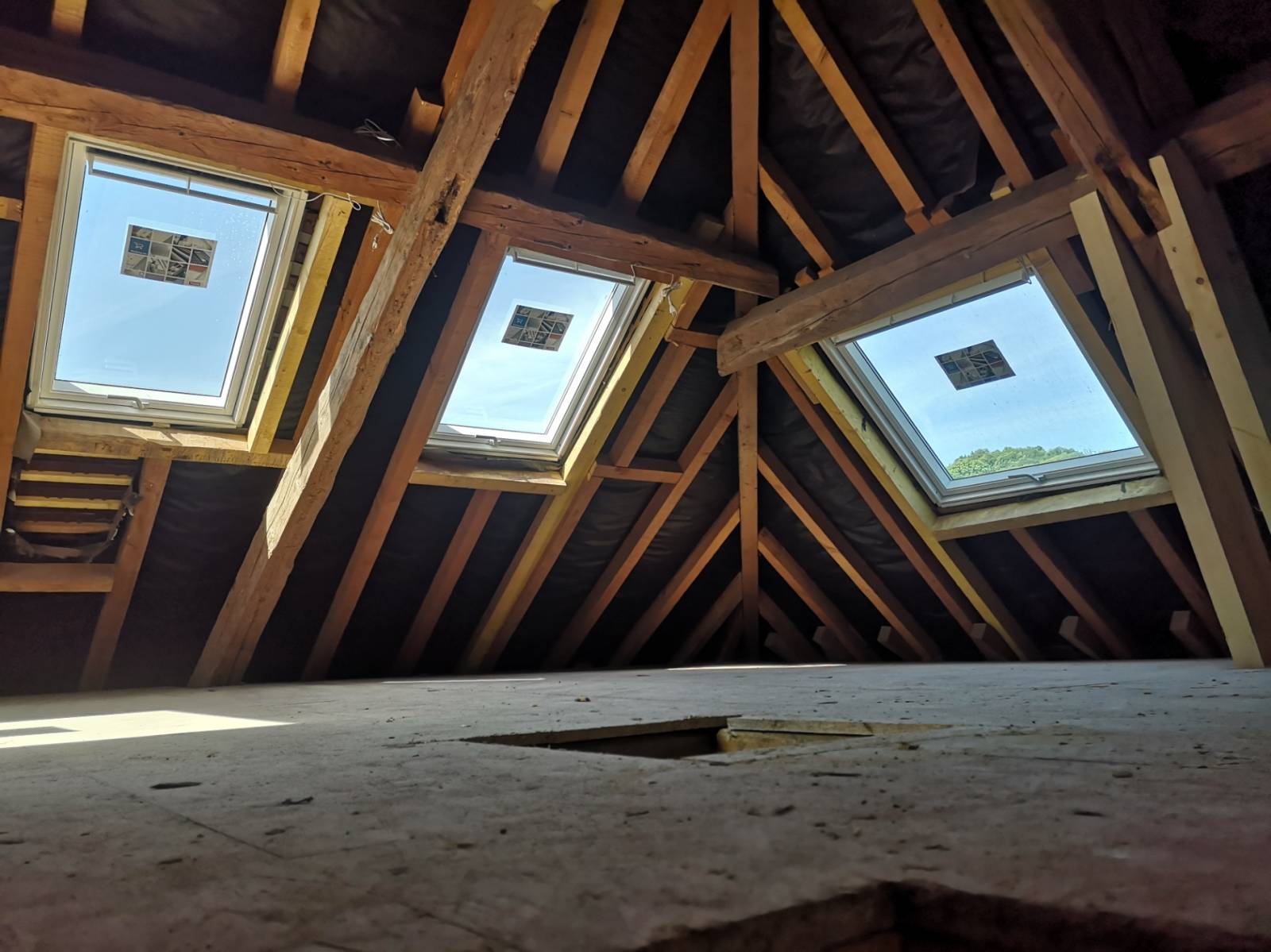 Installation de 8 velux à doubles ouvertures et volets roulants électriques Création des chevêtres avec modification de charpente