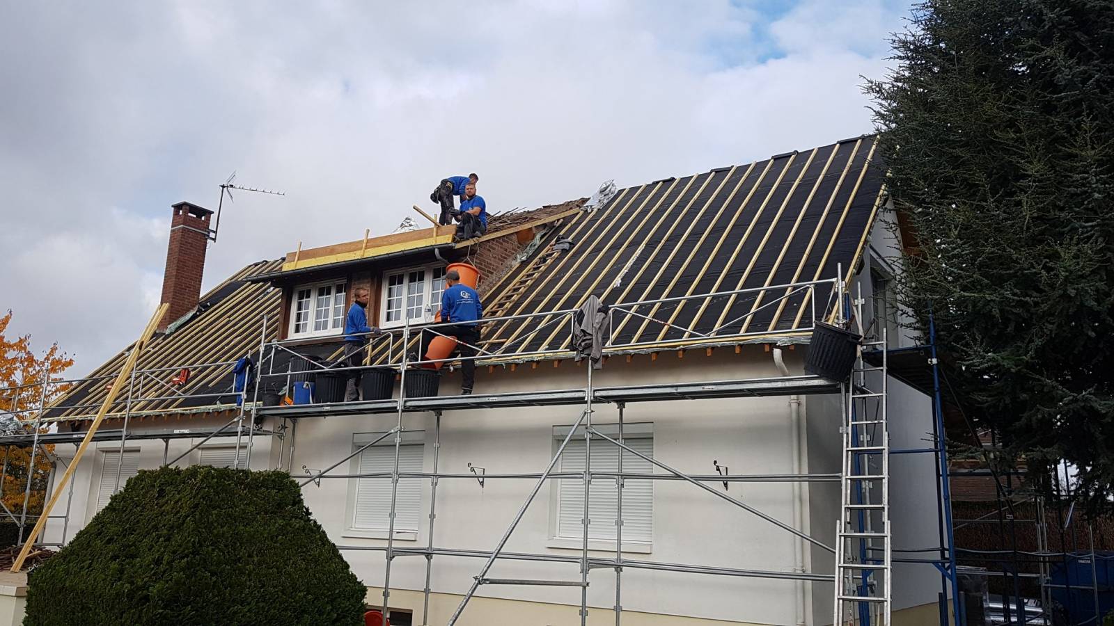 Rénovation de toiture complète Nos clients ont sollicités nos services afin de rajeunir leur toiture et isoler les rampants de celle ci. Les tuiles de pays soufflées par le temps ont laisser place aux tuiles Giverny noires ,l'isolation des rampants a été effectuer grâce à une sous toiture isolante le BOOST’R HYBRID A la fois isolant et écran de sous toiture perméable à la vapeur d’eau, BOOST’R HYBRID permet de réaliser l’isolation et l’étanchéité en une seule opération. Il peut être utilisé posé directement sur voliges et chevrons, et être associé à un autre isolant.