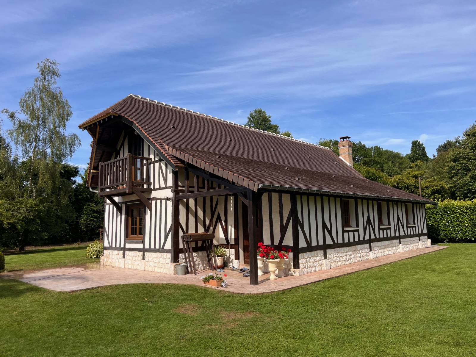 Rénovation totale de la toiture sur une belle maison normande en tuiles plates terre cuite de type Phalempin coloris vieilli au galbe authentique.